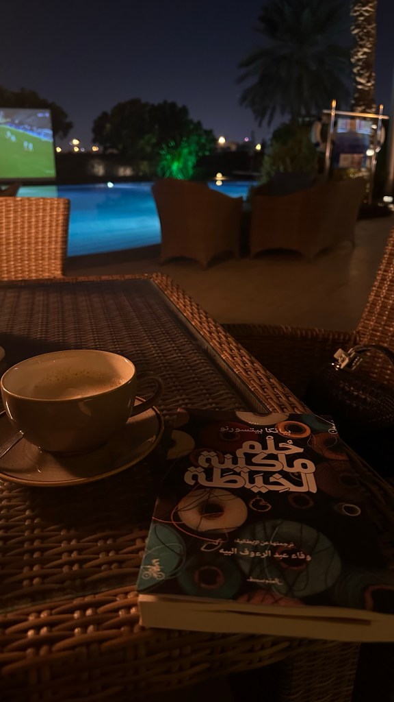 كنت بدأت في ” حلم ماكينة الخياطة ” للروائية الإيطالية بيانكا، وطوال ساعات العمل ظللت أتساءل عما سيحصل مع استر وميس ليلي روز! أكتب هذه التدوينة وأنا متجهة للحافلة، سعيدة بنهاية يوم العمل الثقيل بلا ” كتابي المرافق ” وسعيدة أيضا بالغيم والمطر وكأنهما عوض إلهي وطبطبة على الروح.